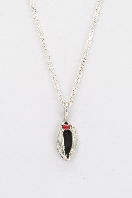 "Artemis" Necklace: Small Silver Vulva Pendant with Red Sapphire